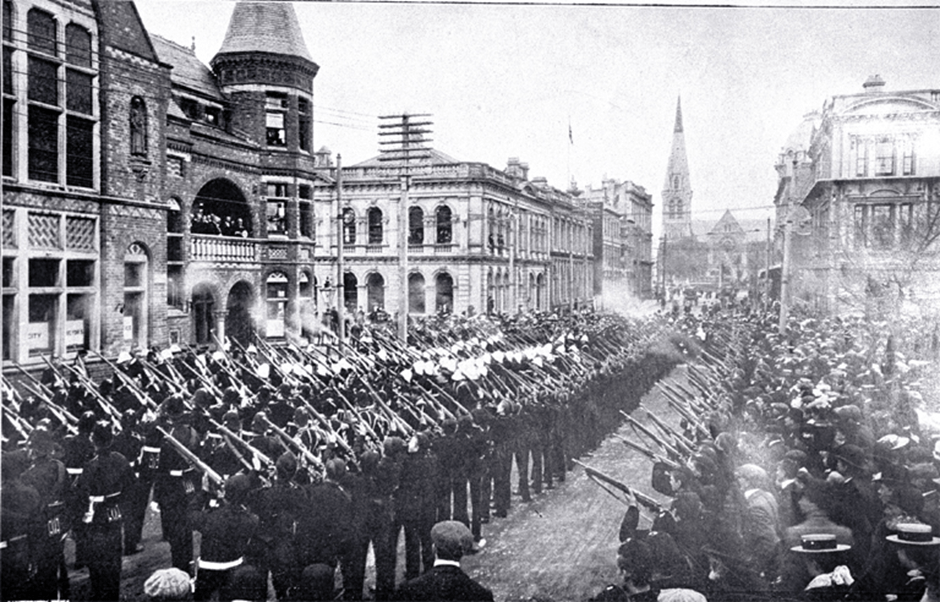 After the war, the newly formed Volunteer units received both Long Magazine Lee-Enfields (“Long Toms”) and some NZ carbines. The Volunteer Corps, made up of local militias, existed from 1865 until 1909, when it became the Territorial Army. Below is a 1907 photo shows hundreds of Christchurch Volunteers with NZ carbines celebrating New Zealand’s new dominion status.